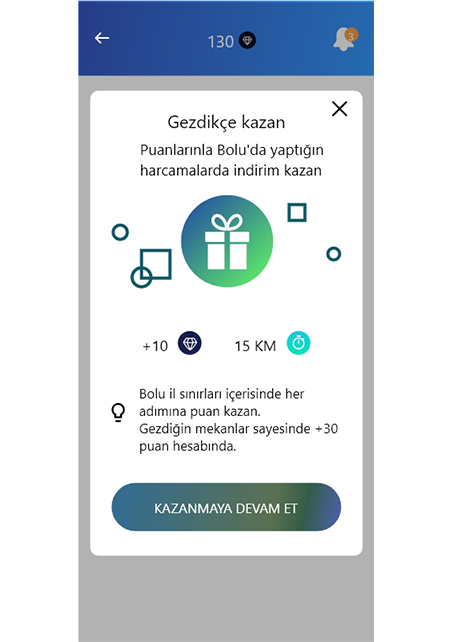Kullanıcılar Bolu içerisinde seyahat ettikleri yerlerdeki Karepanoları taratarak “Gezdikçe kazan puanı” elde etmektedirler. Bu puanlar ile anlaşmalı hizmet noktalarında yaptıkları harcamalarına indirim kazanmaktadırlar. Örneğin Gölcük bungalov evlerinde tek gecelik konaklamada 100 puana sahip kullanıcılar %10 indirim kazanmaktadır. Bu özellik sayesinde ziyaretçilerin daha çok gezmesine ve mobil uygulamayı kullanmasına teşvik amaçlanmıştır. Puanların boşa gitmemesi için harcama isteği olacağından esnafa ekonomik katkıda sunmaktadır.